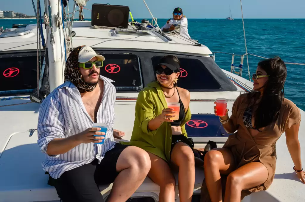 The Party On Board Catamaran Tour offers an exclusive adults-only sailing experience designed for guests who want a lively, fun-filled day on the Caribbean waters. The catamaran is carefully arranged to provide comfort, open space, and shaded areas while allowing you to dance, socialize, and soak in the breathtaking views of Isla Mujeres and the Mexican Caribbean.